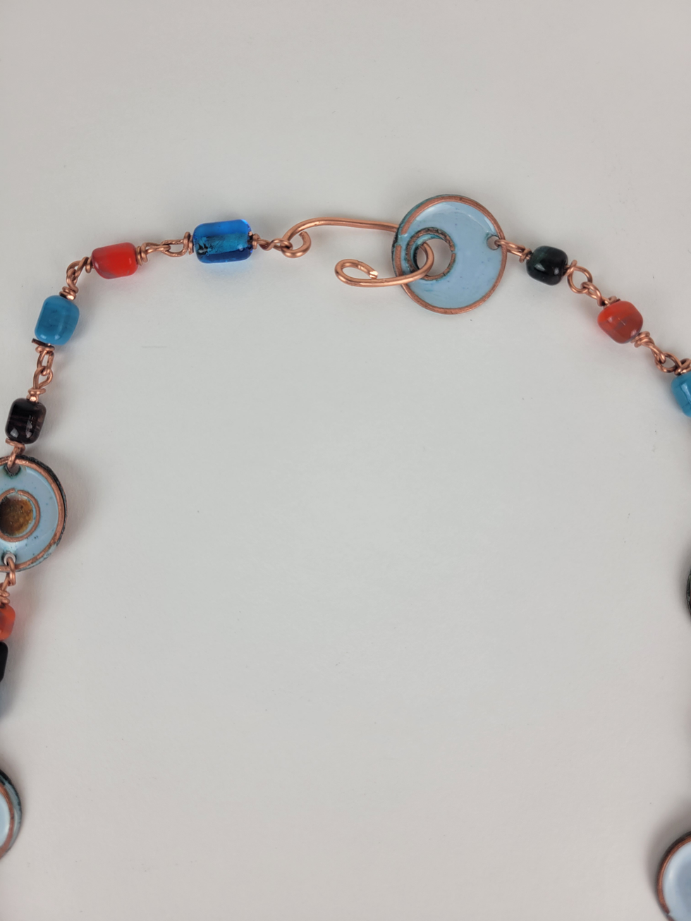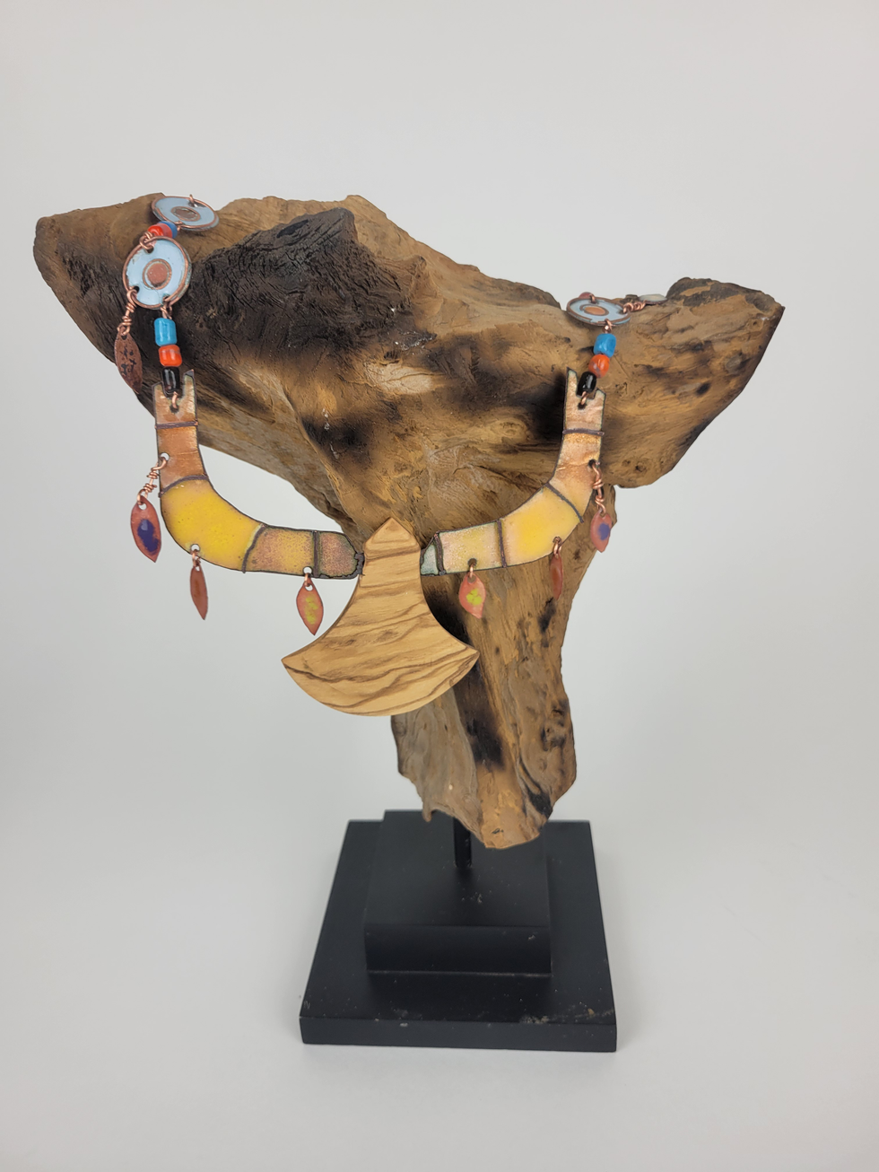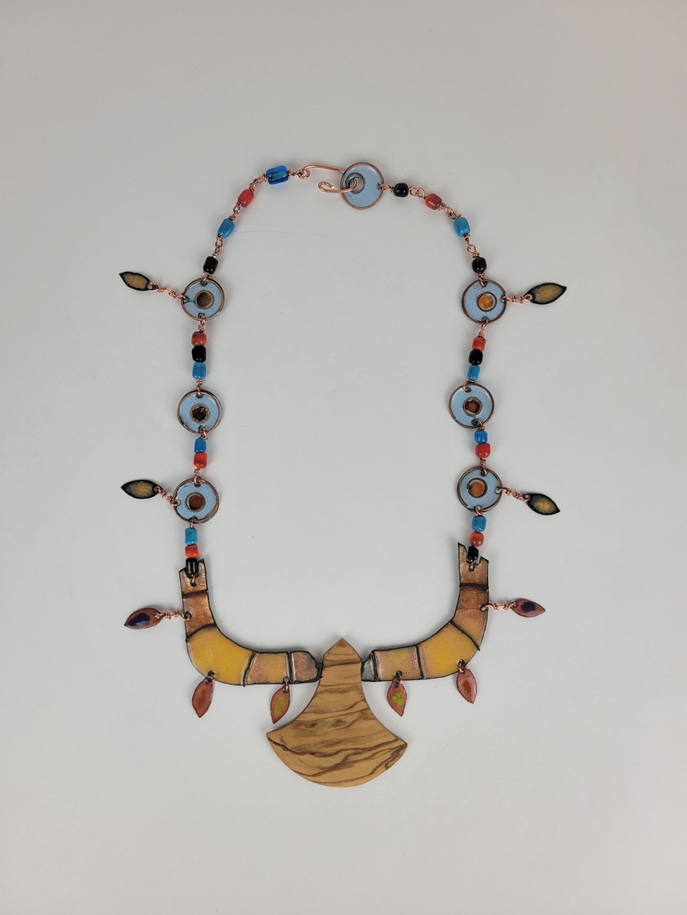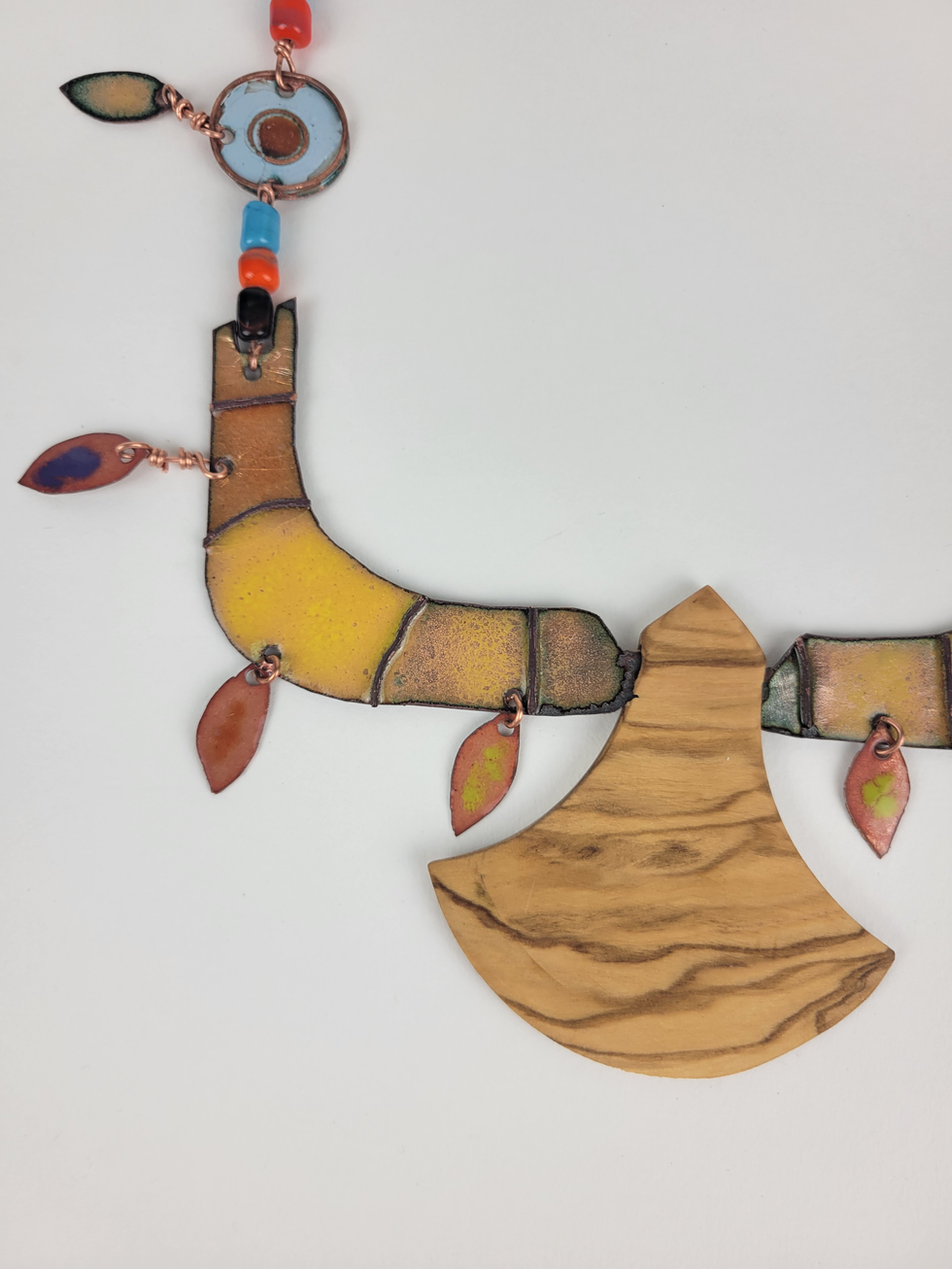 The Painted Sky necklace is a Native American-inspired piece that blends traditional craftsmanship with personal significance. The design features enameled feather-like elements, reflecting the beauty of nature, and a hand-carved wooden axe at the center, symbolizing strength and resilience. The use of bold colors, including blue, orange, yellow, and black, draws from classic Native American beadwork while incorporating a modern artistic approach.