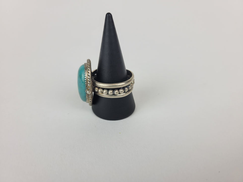 The Painted Sky ring is a sterling silver piece featuring a turquoise stone at its center, cradled by a twisted silver setting and a dotted band. The deep blue of the turquoise reflects the vastness of the sky, while the intricate silverwork adds texture, symbolizing resilience. The combination of these elements creates a timeless design that blends natural beauty with artistic detail.